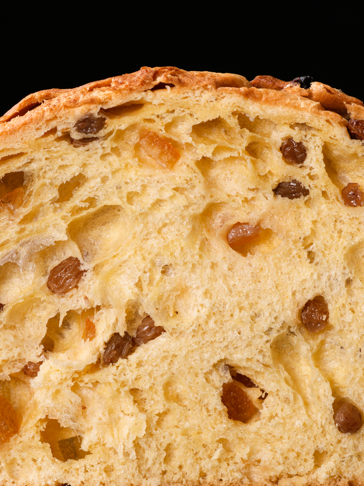 Soffice panettone artigianale al profumo di arancia, miele e vaniglia arricchito con una preziosa selezione di agrumi canditi e golosi chicchi di uvetta sultanina, perfetti per esaltare il tradizionale sapore di festa.